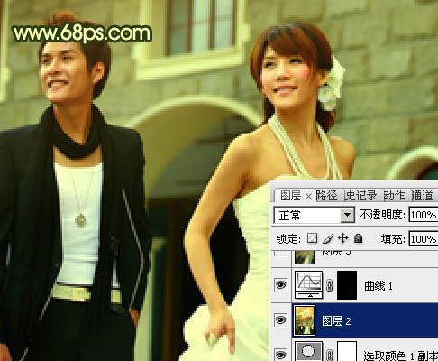 暖色调是婚片中较为常用的色调。调色的方法根据具体素材的色彩构成而异。不过基本思路相同,就是把画面中背景及主体的颜色调成暖调,局部可以根据需要加上一些补色或高光等,增强画面的层次感。