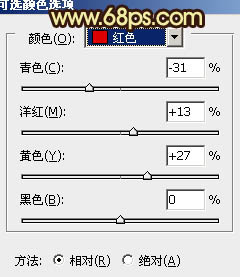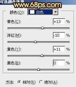3、创建可选颜色调整图层,对红、黄、白、中性色进行调整,参数设置如图9 - 12,效果如图13。这一步给画面增加一些红色和青色,丰富照片的颜色。