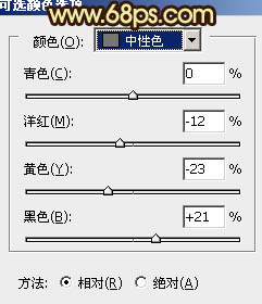 9、创建可选颜色调整图层,对红、黄、绿、青、中性色进行调整,参数设置如图19 - 23,确定后用黑色画笔把人物脸部及肤色部分擦出来效果如图24。