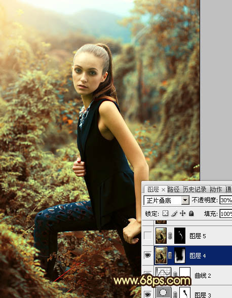 12、新建一个图层,按Ctrl + Alt + Shift + E 盖印图层。混合模式改为“正片叠底”,不透明度改为:30%。按住Alt键添加图层蒙版,用白色画笔把底部边缘部分擦出来,效果如下图。