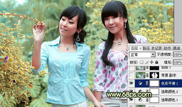 7、再调出人物部分的选区,用色彩平衡调整图层微调一下肤色,大致效果如下图。