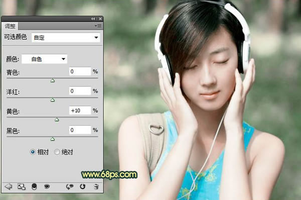 4、由于照片中的人物有些偏黄,创建可选颜色调整图层,选择黄色组,参数如图,效果如图。