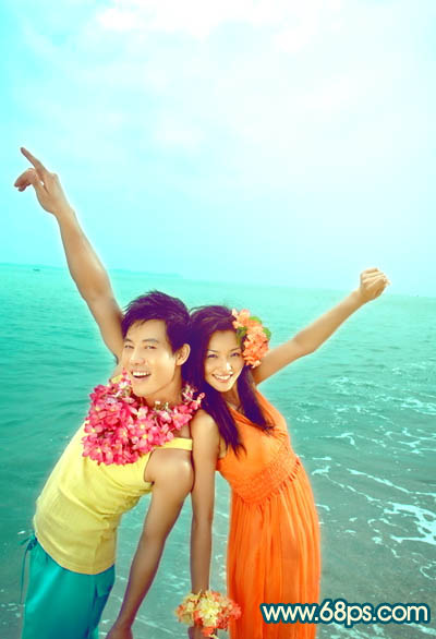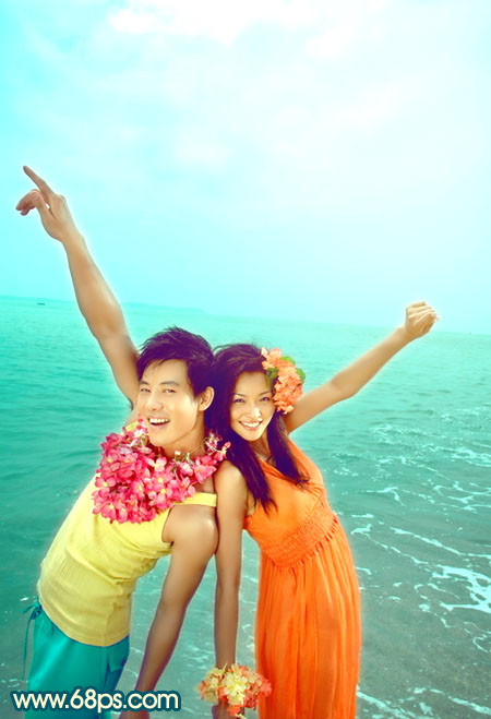 青黄色非常适合海景图片,处理的适合只需要把天空部分及海水部分转为青色,人物及沙滩部分转为橙黄色。再加上高光及暗部等即可。