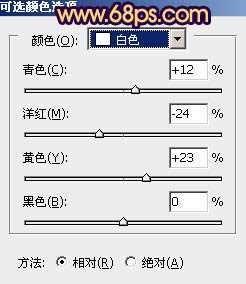10、创建可选颜色调整图层,对白色,黑色进行调整,参数设置如图25,26,效果如图27。这一步调整高光及暗部颜色。