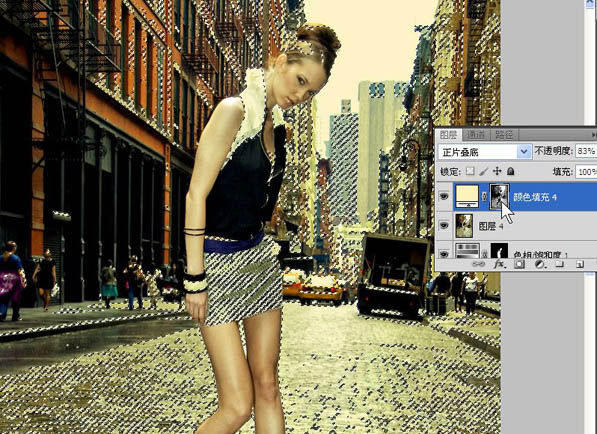 8、盖印图层,调出高光选区,新建纯色填充图层,填充颜色#FDF1BC,确定后把图层混合模式改为:正片叠底,不透明度:83%,然后用黑色画笔把不需要的部份擦除。