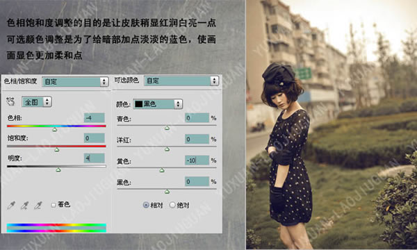9、创建色相/饱和度调整图层,目的是让皮肤稍显红润,白亮一点。可选颜色调整是为了给暗部加点淡淡的蓝色,使画面显色更加柔和。