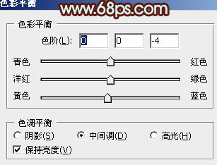 5、创建色彩平衡调整图层,对阴影,中间调进行调整,参数设置如图13,14,确定后用黑色画笔把人物脸部擦出来,效果如图15。