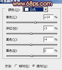11、创建可选颜色调整图层,对黄,白进行调整,参数设置如图23,24,效果如图25。这一步微调高光部分的颜色。