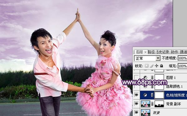 素材图片中人物服饰为紫色,可以搭配的颜色也很多,最融合的就是用相同的颜色紫色。可以用调色工具把背景部分都调为蓝紫色或紫色,然后加强高光,暗部及人物部分颜色即可。