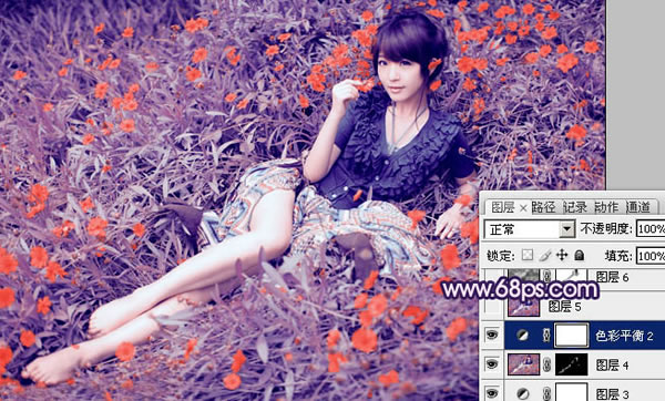 紫红色是非常艳丽的颜色,调色的时候最好先降低图片的亮度,然后再慢慢润色。主体颜色调好后,可以在暗部渲染一些蓝色来丰富画面色彩。