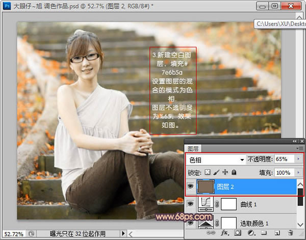 3、新建一个图层,填充褐色:#7e6b5a,混合模式改为“色相”,图层不透明度改为:65%,效果如下图。