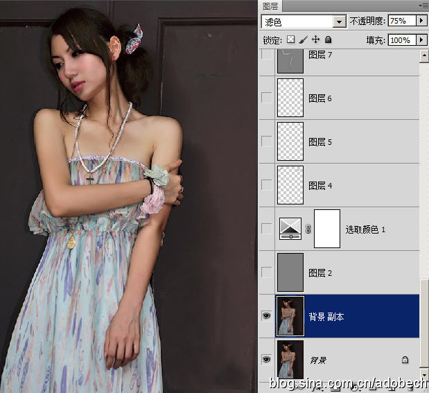 1、打开素材图片,拷贝背景图层,图层模式为滤色,不透明度75,目的提亮人像,如下图。