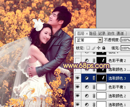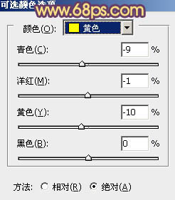 1、打开原图素材,创建可选颜色调整图层,对黄、绿、黑进行调整,参数设置如图1 - 3,效果如图4。这一步把背景部分的黄绿色转为橙黄色,并增加暗部的紫红色。