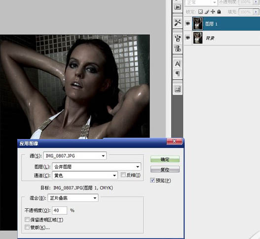4、在CMYK的模式下再一次进行“应用图像”选择黄色通道,混合仍然为“正片叠底”,不透明度改为“40%”,画面再一次暗了下来。