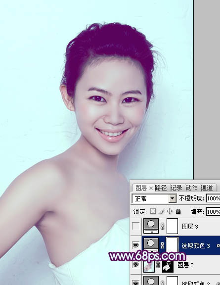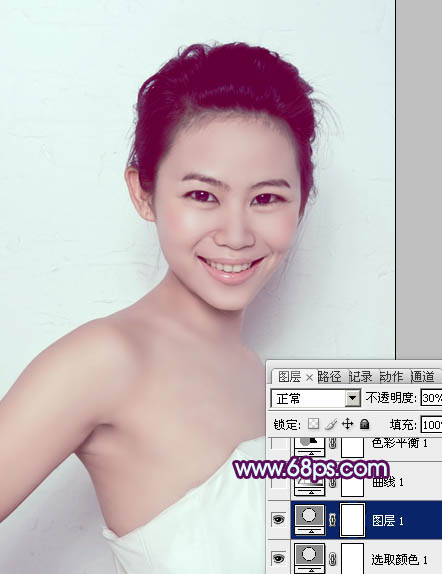 3、按Ctrl + J 把当前可选颜色调整图层复制一层,不透明度改为:30%,加强人物肤色。