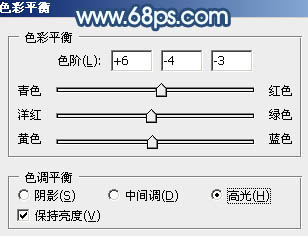 5、创建色彩平衡调整图层,对高光进行调整,参数设置如图13,效果如图14。这一步增加高光部分的淡青色。