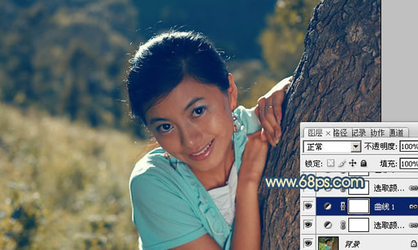 1、打开原图素材,创建可选颜色调整图层,对黄、绿、黑进行调整,参数设置如图1 - 3,效果如图4。这一步把背景主色转为黄青色。