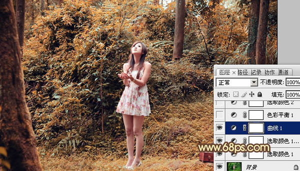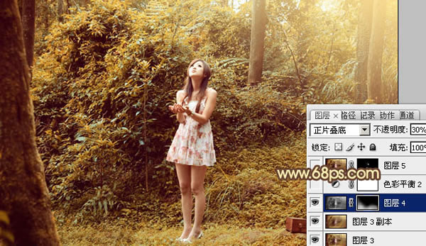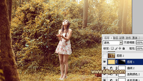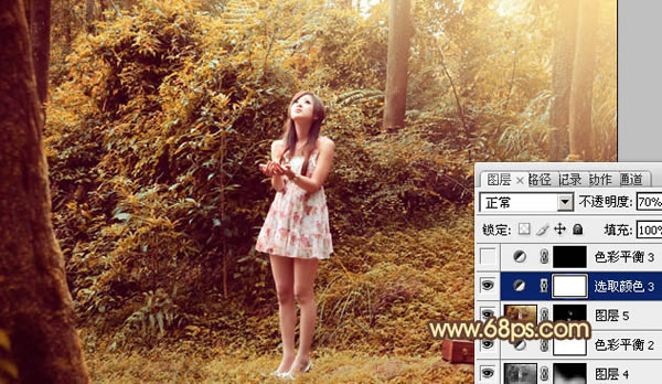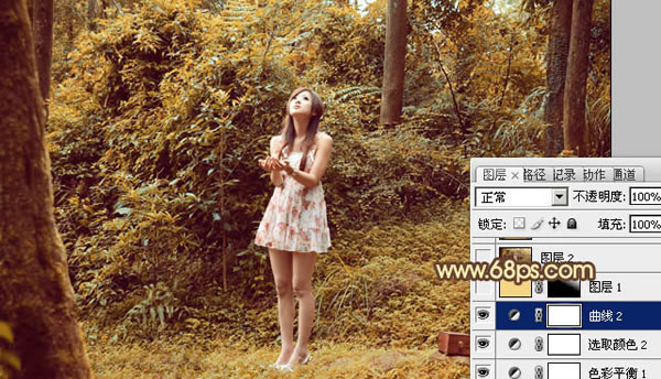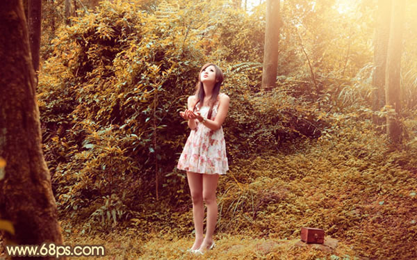 素材图片背景以绿色为主,比较容易调色。调成暖色的话只需要把绿色转为橙黄色,再把暗部的颜色转为红褐色,后期再适当柔化处理即可。