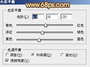 10、创建色彩平衡调整图层,对阴影,中间调进行调整,参数设置如图23,24,确定后把图层不透明度改为:30%,效果如图25。这一步微调暗部颜色。
