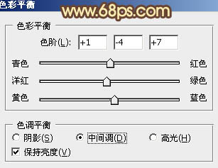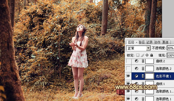 4、创建色彩平衡调整图层,对阴影、中间调、高光进行调整,参数设置如图9 - 11,确定后把图层不透明度改为:30%,效果如图12。这一步给图片增加暖色。