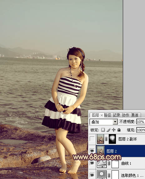 5、新建一个图层,按Ctrl + Alt + Shift + E 盖印图层,混合模式改为“叠加”,不透明度改为:10%。这一步稍微增加图片的对比度。