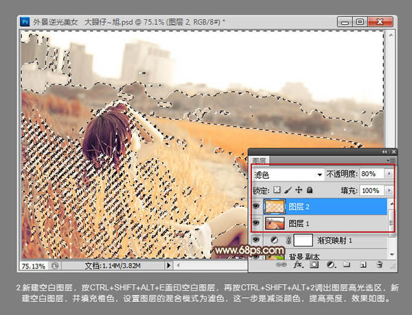 2、新建一个空白图层,按Ctrl + Shift + Alt + E 盖印图层,再按Ctrl + Shift + Alt + 2 调出图层高光选区,新建空白图层并填充橙色,设置图层的混合模式为“滤色”,这一步是减淡颜色,提亮亮度,效果如下图。
