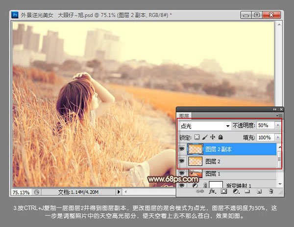 3、按Ctrl + J 复制一层图层2,并得到福步图层。更改副本的混合模式为“点光”,图层不透明度为:50%。这一步是调整照片中的天空高光部分,使天空看上去不那么苍白,效果如下图。
