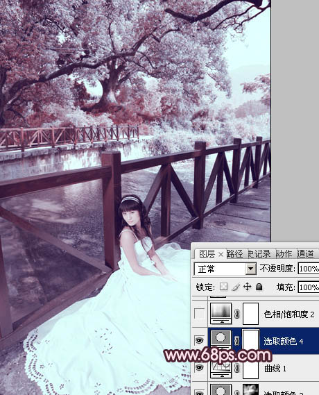 紫红色图片调色过程较为简单,可以直接用通道替换得到双色图片,然后简单转化一下,把双色转为所需的红紫色,后期适当柔化,再微调暗部及高光颜色即可。