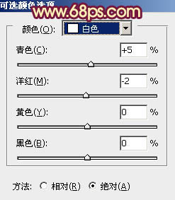 4、创建可选颜色调整图层,对红、白进行调整,参数设置如图8,9,效果如图10。这一步给图片的高光部分增加淡黄色。