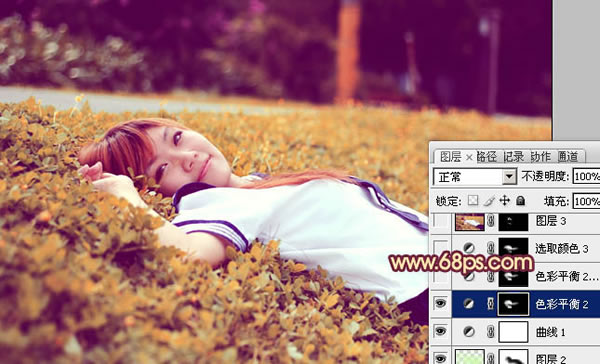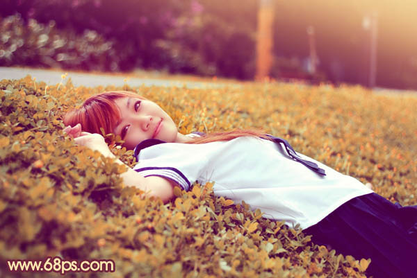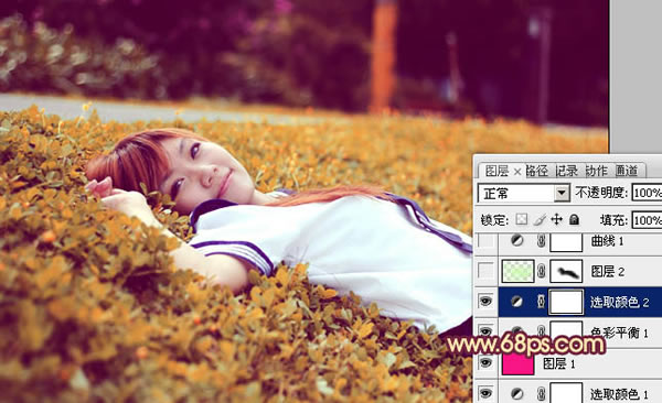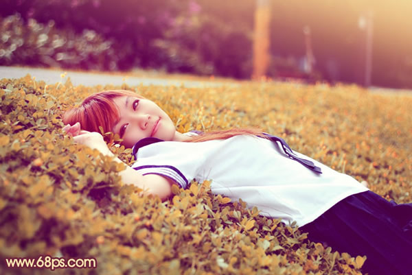 素材图片颜色以绿色为主,色调比较好控制,调成暖色的话只需要把绿色转为暖色,再微调一下人物肤色,然后简单渲染一下暗部及高光即可。
