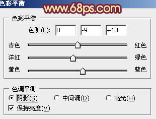 3、创建色彩平衡调整图层,对阴影、中间调、高光进行调整,参数设置如图6 - 8,效果如图9。这一步主要给图片的高光部分增加淡黄色。