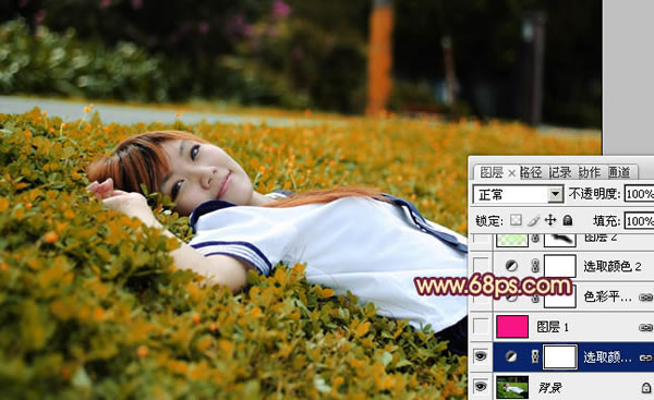 1、打开素材图片,创建可选颜色调整图层,对黄、绿、中性色进行调整,参数设置如图1 - 3,效果如图4。这一步把背景的主色转为橙红色。