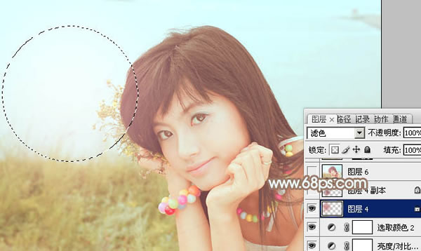 7、新建一个图层,用椭圆选框工具拉出下图所示的椭圆选区,羽化60个像素后填充暗红色:#C6787B,混合模式改为“滤色”,效果如下图。这一步简单增加图片的高光。