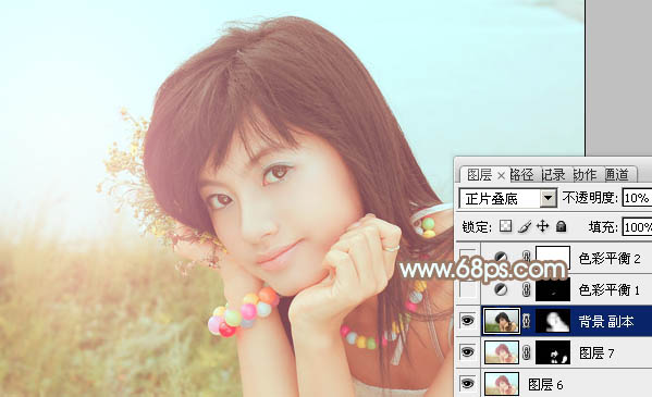 8、把背景图层复制一层,按Ctrl + Shift + ] 置顶,混合模式改为“正片叠底”,不透明度改为:10%,按住Alt键添加图层蒙版,用白色画笔把人物部分擦出来,效果如下图。