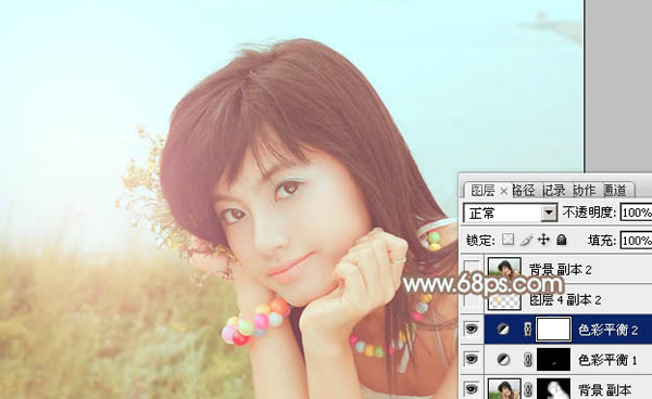 9、创建色彩平衡调整图层,对中间调进行调整,参数设置如图18,效果如图19。这一步微调图片颜色。