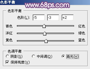 6、创建色彩平衡调整图层,对阴影、中间调、高光进行调整,参数设置如图11 - 13,效果如图14。这一步给图片增加蓝紫色。