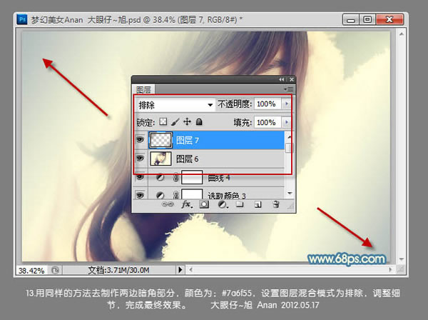 13、用同样的方法去制作两边暗角部分,颜色为:#7a6f55,设置图层混合模式为“排除”,效果如下图。