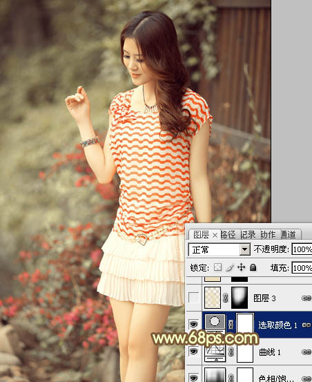 素材图片以黄绿及紫红色为主。我们需要的颜色是黄褐色,因此调色的时候只需要把背景部分的黄绿色转为黄褐色,再把紫色转为橙红色即可。暗部及高光可以按照需要稍微渲染一下。