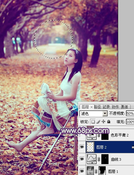 11、按Ctrl + Alt + 2 调出高光选区,按Ctrl + Shift + I 反选,新建一个图层填充蓝紫色:#522271,混合模式改为“滤色”,不透明度改为:50%,效果如下图。这一步给图片的暗部增加蓝紫色。