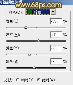 1、打开素材图片,创建可选颜色调整图层,对黄,绿进行调整,参数设置如图1,2,效果如图3。这一步增加图片背景部分的暖色。