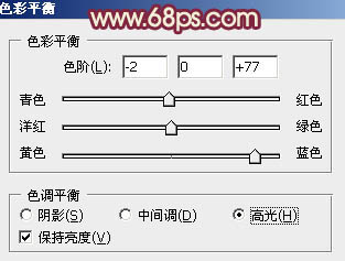 8、调出当前图层蒙版选区,创建色彩平衡调整图层,对中间调,高光进行调整,参数设置如图22,23,效果如图24。这一步把人物肤色部分调红润。