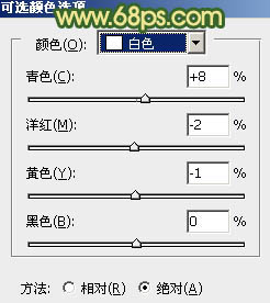 6、创建可选颜色调整图层,对绿,白进行调整,参数设置如图17,18,效果如图19。这一步加强图片的绿色,并给高光部分增加淡青色。
