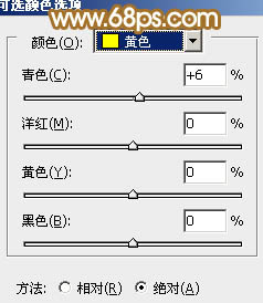 8、创建可选颜色调整图层,对黄色进行调整,参数设置如图23,确定后把蒙版填充黑色,用白色画笔把人物脸部擦出来,效果如下图。这一步把人物脸部的颜色调均匀。