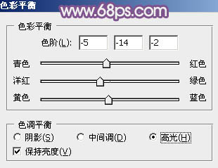 4、创建色彩平衡调整图层,对阴影、中间调、高光进行调整,参数设置如图10 - 12,效果如图13。这一步主要给图片增加紫色。