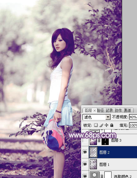7、按Ctrl + Alt + 2 调出高光选区,新建一个图层填充淡紫色:#9F96A2,混合模式改为“滤色”,不透明度改为:40%,效果如下图。这一步稍微增加图片亮度。