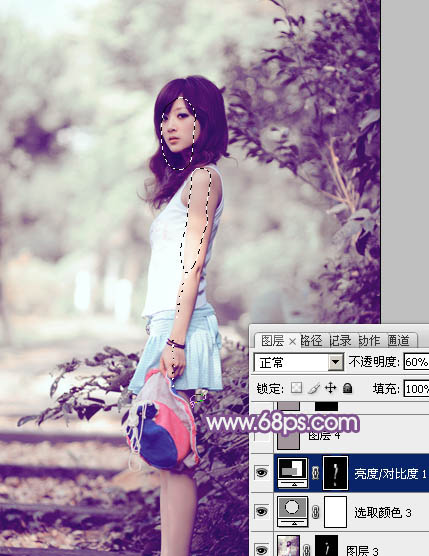 6、按Ctrl + Alt + 2 调出高光选区,按Ctrl + Shift + I 反选,新建一个图层填充暗紫色:#5D3266,混合模式改为“滤色”,不透明度改为:30%。这一步给图片暗部增加紫色的同时增加图片的亮度。