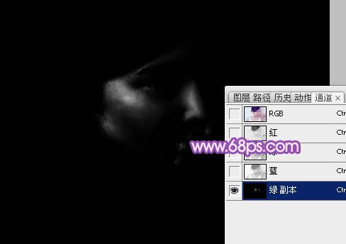 5、新建一个图层,按Ctrl + Alt + Shift + E 盖印图层,进入通道面板,把绿色通道复制一层,得到“绿副本”通道,按Ctrl + M 把把整体调暗,再用黑色画笔把脸部以外的部分涂黑,效果如下图。