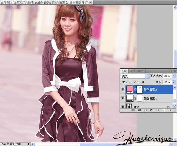2、再新建纯色填充图层,填充粉红色#FF91B4,图层模式:柔光,然后添加蒙版,用灰色画笔擦一下头发。