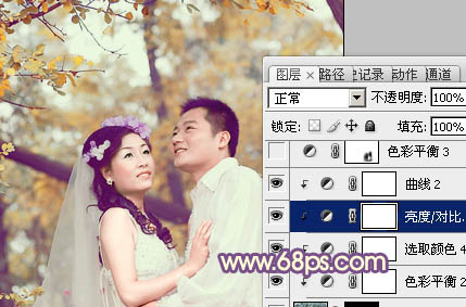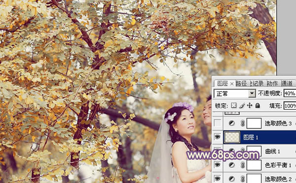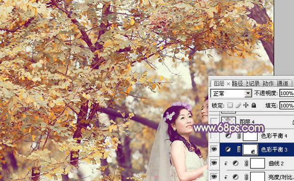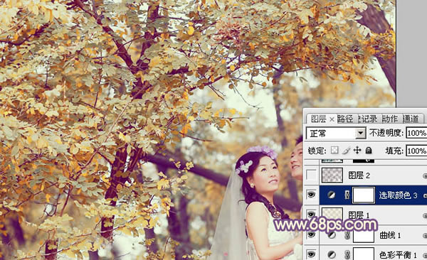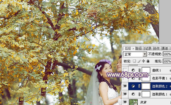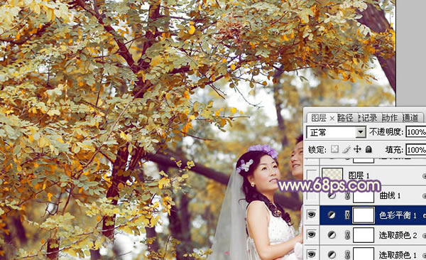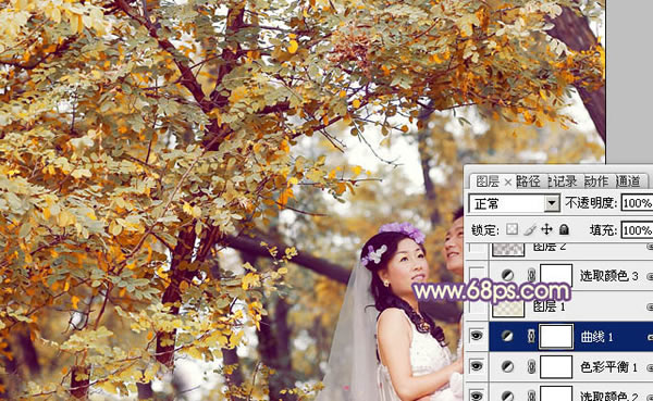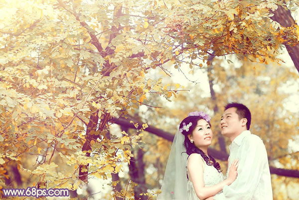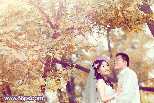 秋季色的颜色比较多,有橙色、橙紫色、黄褐色、橙红色等。这里介绍较为柔和的黄褐色调色方法。大致思路:先用调色工具调出图片的主色,然后适当把图片柔化处理,再适当美化一下人物即可。