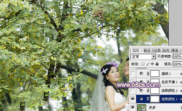 1、打开素材图片,创建可选颜色调整图层,对黄,绿进行调整,参数设置如图1,2,效果如图3。这一步把背景部分的黄绿层次拉大。